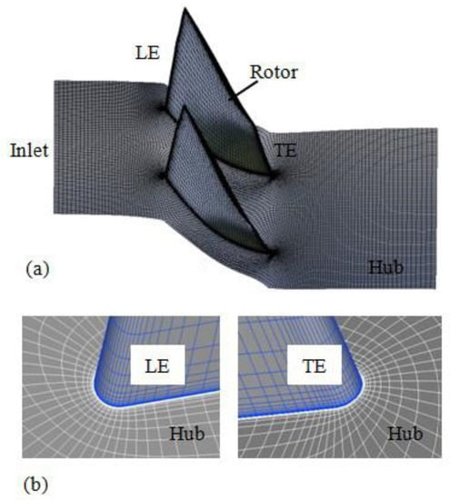 NUMECA FINE computational mesh. (a) Perspective view and (b) View from casing at LE and TE of hub.