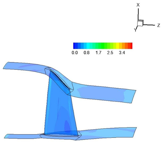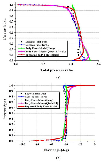 Figure 12 illustrates a comparison of the Rotor 37 pressure ratio versus the MFR at 80%, 90%, and 100% of the designed rotor speed. It was shown that NUMECA FINE and the improved body force model results agreed very well with the experimental data obtained from the AGARD Advisory Report 355 entitled CFD Validation for Propulsion System Components. The experimental values were slightly higher than the simulation results. The maximum error was 1.2%. At other speeds, the simulation that used the improved body force model generally agreed well with the NUMECA results. The maximum error was 1.9%, which was still within the acceptable error range. Compared with Li’s model [15], the results using the improved body force model were better at lower MFR points. Therefore, the improved body force model could capture the flow field through a turbomachinery blade row well within a proper accuracy range.