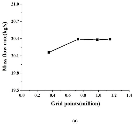 A series of computations were conducted with four different meshes to verify the solution errors related to the grid by imposing the same boundary conditions, and the MFR and adiabatic efficiency are shown in Figure 7. The figure illustrates that the adiabatic efficiency and MFR remained basically the same when the mesh number reached 734,761. So, the grid that consists of a total of 734,761 meshes was selected to achieve the mesh independence needed to provide the flow field analysis in detail.
