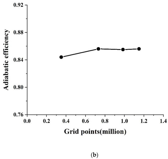 Mesh independence verification. (a) Mass flow rate and (b) Adiabatic efficiency.
