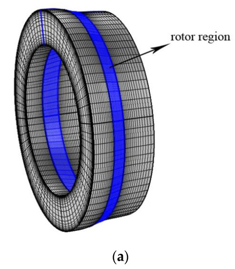 High Mach Number Flow (HMNF) as a COMSOL–CFD module was selected to add body forces into the governing equations for simulating the pressure rise, flow turning, and loss effects caused by the blade rows in this study. The finite element method was employed to discretize the RANS equations, and the one equation S–A turbulence model was used the same as the turbomachinery flow simulation. In the HMNF module, segregated solvers were used to compute the flux, in which Newton’s method was executed. For 3D numerical full-annulus simulations, the full-annulus grid of the compressor was chosen as a hexahedral structure grid, and local encryption near the wall was carried out. The boundary conditions were the same as in the NUMECA FINE simulations. The HMNF module computational mesh for the Rotor 37 is shown in Figure 8, and the rotor region is marked in blue. The grid consists of a total of 75,600 meshes and is appropriate in achieving the mesh independence needed to provide the flow field analysis in detail, as shown in Figure 9.