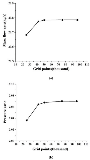 Mesh independence verification. (a) Mass flow rate; (b) Pressure ratio.