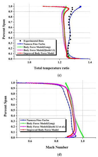 Figure 13 presents the pitch-averaged total temperature ratio, total pressure ratio, Mach number, and swirl angle at the outlet along the spanwise direction for a 98% choked mass flow (Figure 12) for the experimental data, NUMECA FINE, and body force models. Compared with the Gong and Li models, the distributions of the performance parameters around the hub and shroud obtained using the improved body force model were better and agreed well with the experimental data. The errors about the NUMECA FINE and improved body force model in the comparisons with the experimental data in Figure 13a–c are listed in Table 2. Figure 14 presents the Mach number contours, pressure contours, total pressure contours, and swirl angle contours on the meridional plane for a 98% choked mass flow. The comparison between the NUMECA FINE and the improved body force model indicated that the results’ overall distribution trends were basically the same. In the rotor region illustrated in Figure 14, it could be approximated that the pressure and total pressure increased linearly along the streamwise direction. The inlet airflow was also deflected through the blade passage, with the flow angle increasing almost linearly.
