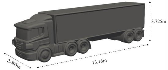 In this study, we chose the SCANIA R-series heavy-duty vehicle with a 13.0 liter diesel engine with its maximum brake power, 500 hp. This model vehicle has been used for on-road tests for aerodynamic performance analysis of vehicle platooning in previous empirical studies, due to occupying a large position in the transportation and logistics market worldwide [15,16]. The simplified model vehicle was used for this numerical study, and the solid model with the geometric dimensions 13.16 m × 2.495 m × 3.725 m (Length × Width × Heigth) is given in Figure 1.