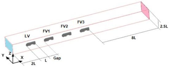 The numerical domain size was defined as shown in Figure 2. Especially, 8 L was given at the rear side of the last model vehicle for stable convergence on the simulation result.