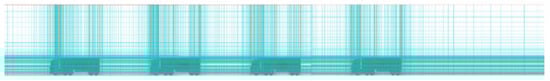 Figure 3 shows a typical grid in the numerical domain with four model vehicles keeping their distance (1 L) in between. For the optimum grid in the domain, the grid convergence test was conducted by thorough grid dependence evaluation with different iterations and very nicely converged with the cut-off error of the residual fraction of the main properties less than 0.01%. The optimum grid size was decided to be (658 × 99 × 87), and the total number of the grid was 5,667,354.
