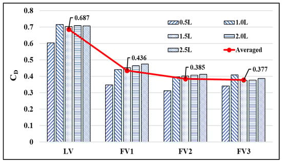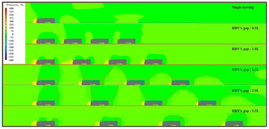 The CD of the leading vehicle (LV) is 0.6 at 0.5 L condition, which is 15% lower than the single vehicle moving (SV) (Table 3). It is due to the rear pressure recovery because of the higher stagnation pressure formed on the frontal surface of the following vehicle (FV1). However, the CD of LV does not change much under the different distance conditions. However, FV1, FV2, and FV3 have a serious reduction in CD, and the average reduction compared to SV is about 44% which is similar to the results reported in the previous study [24].
