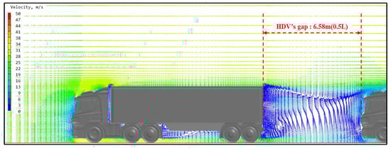 The fuel consumption of SV by aerodynamic resistance was calculated as 5.2 km/liter at 100 km/h from Equation (10). When a single vehicle was moving, the fuel efficiency of FV1, FV2, and FV3 can be predicted as shown in Table 4. As a result, among simulation cases, the possibility of increasing the fuel efficiency of FV 1, 2, and 3 to 10 km/L is also confirmed under the 0.5 L conditions with maximum aerodynamic effects (100 km/h cruising driving condition).