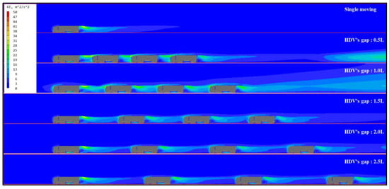 Figure 8 shows the turbulent kinetic energy distribution between the model vehicles with the different gaps. As the gap is shorter, the kinetic energy formed between the vehicles is higher and it is the reason for the lower static pressure formed in the gap, and it contributes to the lower stagnation pressure formed on the frontal face of the following vehicles.