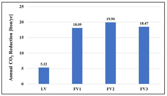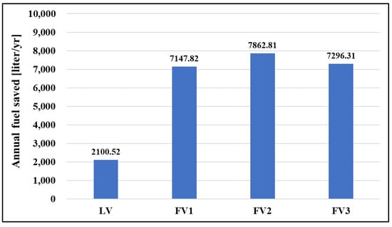 Based on HDV’s gap of 0.5 L, LV kept 2100 liter per year compared to SV. The saved result of an average of 7435 liter of FVs is shown in Figure 10. CO2 reduction is calculated through Equation (11), resulting in LV saved by 5.3 tons per year and FVs saved by an average about 18.8 tons per year compared to the SV (Figure 11).