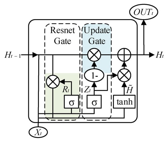 For GRU, its input and output are the same as those of a normal RNN. As shown in Figure 2, the input is the input Xt at time t, and the hidden layer state Ht−1 at time t − 1, which contains the information about the previous nodes. The output is the hidden node output OUTt at time t and the hidden layer state Ht passed to the next node. In addition, ResNet gate is used to capture short-term dependencies. Update gate is used to capture long-term dependencies. The update equation of GRU at moment t is as follows: