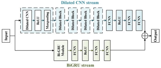 Since both dilated CNN and BiGRU introduced in the previous two sections can extract features from time-series information and mining correlations, they are now heavily used in time-series detection tasks [32,33,34]. To make full use of both networks, this paper design a hybrid network, namely dilated CNN-BiGRU, to achieve the estimation of the battery SOH. The overall network structure of the proposed network is shown in Figure 4. Dilated CNN-BiGRU contains two streams, one is the dilated CNN stream and the other is the BiGRU stream. The dilated CNN stream contains five cascaded dilated CNN modules, each contains a dilated convolution layer, a ReLU activation function, a maxpooling layer, and the five cascaded dilated CNN modules are followed by connecting three fully connected layers. The BiGRU stream contains two BiGRU layers followed by three fully connected layers. The role of the fully connected layers is to reduce the dimensionality to one dimension before the final output for subsequent summation. Finally, the output of the two streams is added as the capacity prediction result.