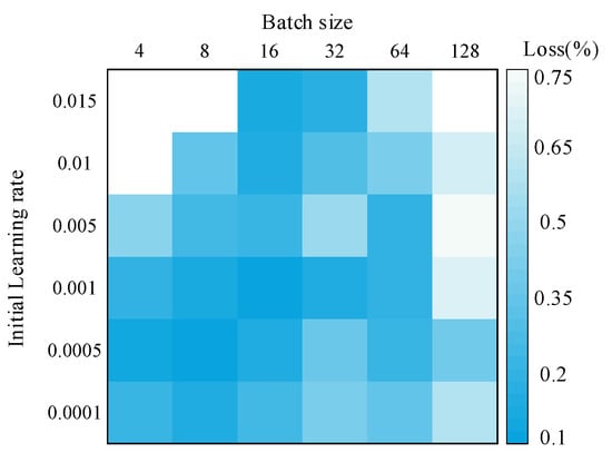 Step 2: Model setup and initialization. Set the dilation rate of the dilated CNN and the number of hidden layers of the BiGRU, set the hyperparameters, and set the optimization algorithm. First, to avoid the problem of discontinuity of centroids in the feature map, we set five dilated convolutions with different dilation rates, 1, 3, 9, 27, and 81, respectively. In addition, to obtain a lower loss, we conduct several sets of experiments and determine the hidden layer size of the BiGRU to be 8. Second, we set the network hyperparameters, including epoch, learning rate, and batch size. For the epoch, we can see from Figure 5 that the loss decreases as the epoch increases, and the loss reaches the lowest and tends to be constant when the epoch reaches 150, and a larger epoch leads to a meaningless increase in time, so we set the epoch to 150. For the learning rate, during the training process, when 10 epochs pass without the model performance improving on the test set (i.e., the loss function value is not improved), the learning rate is adjusted to 0.75 times the previous one. By this method of adaptively changing the learning rate, the convergence of the model is improved to some extent. Different initial learning rates and batch sizes will directly affect the convergence minimum of the objective function. Therefore, we determine the initial learning rate and batch size by the control variable method, and ensure that the other parameters are consistent during the experiments. The results are shown in Figure 7. Taking into account the time cost and the value of the loss function (the larger the batch size, the longer the training time), we set the batch size to 16 and the initial learning rate to 0.0005. Finally, we use the Adam optimizer to optimize Equation (13), which combines the advantages of AdaGrad and RMSProp, with fast convergence speed and easy parameter adjustment.