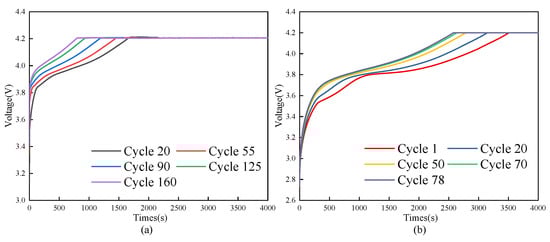 The charging voltage curves for the NASA dataset and the Oxford dataset are shown in Figure 8a,b, respectively; and capacity decay curves of some batteries are shown in Figure 9a,b, respectively.