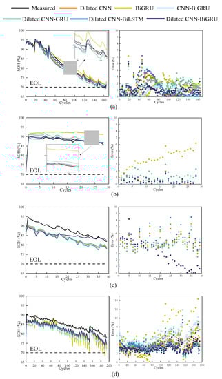 NASA dataset: For the NASA dataset, B0007, B0028, B0032, and B0036 are used as the test set and the other nine cells as the training set in this paper. The experimental results are shown in Figure 10. Overall, all methods can achieve the estimation of battery SOH. Figure 10a–d represent the estimation results of B0007, B0028, B0032, and B0036, respectively. For Figure 10a,b, the errors of all six methods are small except for BiGRU, and the error of BiGRU is slightly larger, which may be due to the failure of a single BiGRU network to achieve adequate modeling of a relatively small amount of original data; in addition, the error of dilated CNN-GRU is a little larger than the other methods, which may be due to the disadvantage of GRU compared to BiGRU when dealing with time-series information. For Figure 10c,d, the estimation errors of all six methods increase significantly, but our proposed dilated CNN-BiGRU network still achieves an error within 5% on B0036 and within 3% in the last 20 cycles of B0032. The curves predicted by the other methods showed a large deviation, especially for the BiGRU-based method, which may be due to the failure of a single BiGRU network to achieve adequate modeling of a relatively small amount of original data.