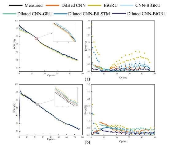 Oxford dataset: For the Oxford dataset, Cell 4 and Cell 8 are used as the test set and the other six cells are used as the training set in this paper. The experimental results are shown in Figure 11. Overall, all six methods can achieve the estimation of battery SOH, and the error can be kept within 2.5%, which are all lower than those in the NASA dataset. This is due to the fact that the cell data in the Oxford dataset are all obtained under the same simple operating conditions, without extreme operating conditions such as high temperature and low temperature. From Figure 11a,b, it can be seen that the errors obtained by BiGRU are larger compared to the other five methods, which may be due to the limitations of BiGRU as a single neural network for time-series estimation, which further proves the advantages of the proposed hybrid dilated CNN-BiGRU network over the single network. For overall comparison, it can be concluded that the proposed network is superior in estimating the battery SOH and the errors can all be kept within 0.5%.