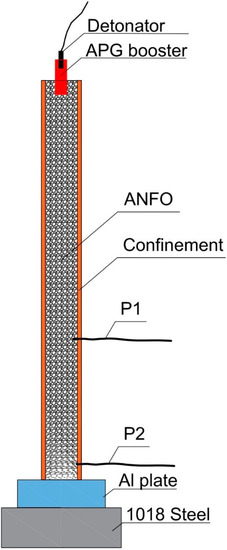 The steel tubes were placed vertically on a 40 mm thick aluminum plate. AlMgSi 0.5 aluminum was used as the witness plate, and the aluminum plate was placed on a 1018 steel plate, which served as a buffer plate. For the same explosive load, the dent in the aluminum plate was much larger than in the steel plate, which enabled a more reliable measurement of the dent. The test setup is shown in Figure 2.