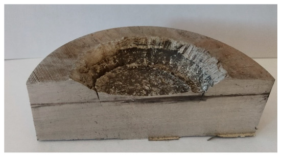 During the measurement, the detonation velocities were recorded, and after the measurement, the aluminum plates were cut in half and the depths of the resulting dents were measured. Three experiments were carried out for each tube, and the mean value of measurement is presented. One half of the aluminum plate after detonation is shown in Figure 3, and the results of measurement are in Table 1.