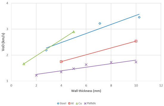 As shown in Table 1, a stable detonation velocity was measured in seven of eight samples, and in one sample, the detonation process stopped a few centimeters after the initiation point. Although the charge diameter was similar, only in this case was the detonation stopped for aluminum with a wall thickness of 2.5 mm, which clearly showed the influence of confinement on the critical diameter of ANFO explosive. For all metals, the detonation velocity increased with the thickness of the tube wall, which indicated that confinement had a similar effect on the ANFO detonation velocity as the diameter of the charge. In both cases, the increase in detonation velocity was associated with the reduction in the radial expansion of detonation products, i.e., energy loss. The effect of wall thickness on VoD for different metals is shown graphically in Figure 4. To show the difference in VoD between metals and PMMA, data on the measurement of VoD of ANFO in PMMA tubes with a diameter of 40 mm and different wall thicknesses were taken from the literature [14].