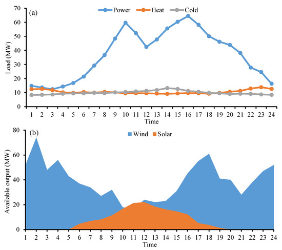 Based on the system operation analysis, the daily cooling, heating, and electricity load demand for each time was obtained, as shown in Figure 2a. The typical daily wind and solar power supply can be obtained through analyzing the meteorological data in the location, as shown in Figure 2b. Water resource consumption intensity control of the integrated energy system in the park was set as: ‘no water resource dissipation control’ (scenario S0), ‘water resource dissipation intensity 0.3 L/kwh’ (scenario S1), ‘0.25 L/kwh’ (scenario S2), and ‘0.2 L/kwh’ (scenario S3). In order to make full use of the demand-side resources and promote new energy consumption, the time-of-use price of electricity, heat, and cold were introduced with the function of stimulating and encouraging energy users to shift peak, fill valley and optimize the power consumption mode. Table 2 presents the time-of-use prices of different energy supply types in the energy system.