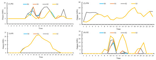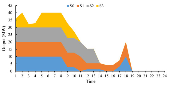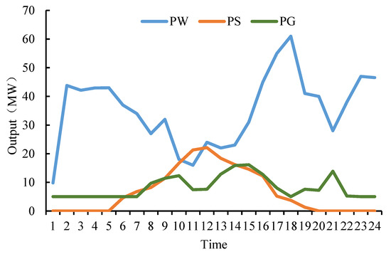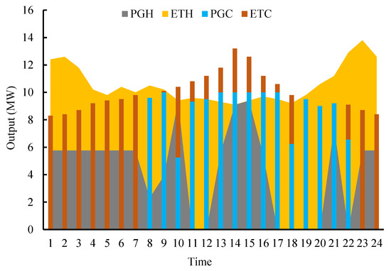 Figure 3 presents the optimized output from wind, photovoltaic, and gas generation units under the S2 scenario. In general, the photovoltaic unit would generate the maximum output during the whole operation cycle (0:00–24:00), and the wind turbine would maintain the maximum output from 04:00 to 23:00. However, compared with wind and photovoltaic units, the output of gas-fired units would have a little volatility. The maximum output was 16.1 MW, which appeared in 14:00–15:00, and the minimum output of 5 MW would be in 22:00–7:00. Comparing the output of different units, the results indicate that the wind power output unit would have the largest output, and clean energy would be greatly utilized in each time-period. In addition, the output of the gas turbines unit would have a little fluctuation during the whole load supply period, and this would ensure comprehensive supply security for the energy system. In the integrated energy system, renewable energy could be utilized to an extreme for suppyling multiple energy flows, and the traditional power generation technologies would play subsidiarity as security assurance rulers.