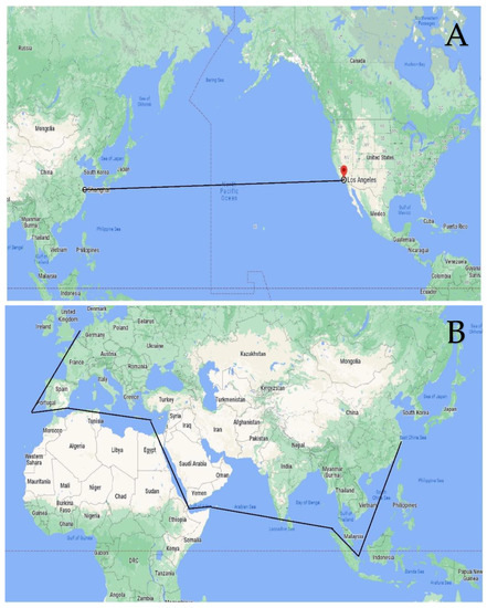(A) The first journey route Shanghai, China, to Los Angeles, USA; (B) the second journey was from Shanghai, China, to Hamburg, Germany.