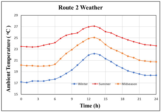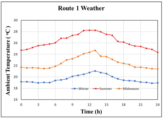 The ambient temperature during each season determined for routes 1 and 2 are shown in Figure 4 and Figure 5, respectively.