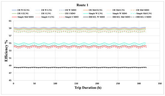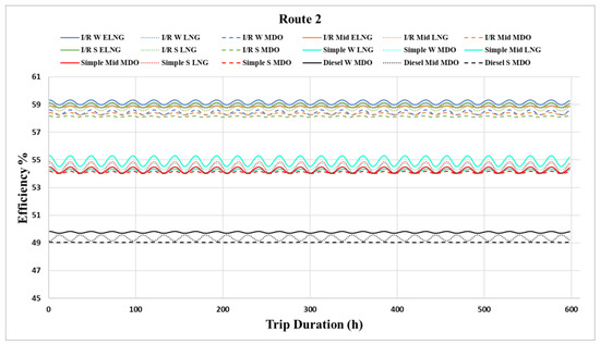 Figure 6 and Figure 7 display the thermal efficiencies of the propulsion systems of the large container ships plotted for all cycles against the journey times of routes 1 and 2 for all seasons. They show that the efficiency of the I/R ELNG CCGT cycle exceeds those of the CCGT cycles fuelled by LNG and MDO in all seasons by approximately 1% and 2%, respectively, due to the lower inlet temperature, which increased the air density and thus the turbine output. The higher calorific value of natural gas as compared with that of diesel oil, reduces the amount of fuel needed to produce the same heat output; therefore, the fuel efficiency of natural gas is higher than that of MDO in all CCGT cycles. The efficiency of LNG in all CCGT cycles was approximately 1% higher than that of MDO fuel. The maximum efficiency of the CCGT cycles was approximately 11% higher than the two-stroke diesel engine, and the minimum efficiency value was approximately 4% higher than two-stroke diesel engine due to the low specific fuel consumption of CCGT. The winter season demonstrated the highest efficiency because the power output depended on the air mass flow. The hot air was less dense than cold air, which reduced the power output. In addition, warm air requires more energy to compress than cold air, which increases the work performed by the compressor and internal energy losses. The ambient conditions of routes 1 and 2 were different, and route 1 was more energy efficient than route 2.