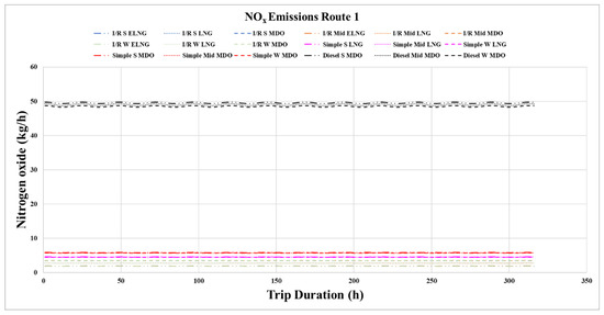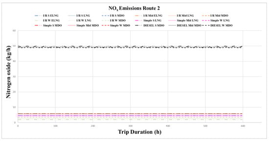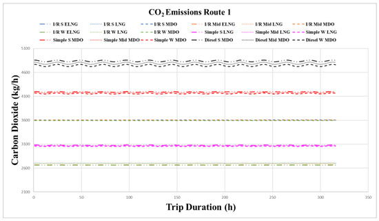Figure 8, Figure 9, Figure 10 and Figure 11 show the environmental CO2 and NOx emissions generated during the ship’s operation for one year on the three-season routes. It was found that CCGT emitted less NOx and CO2 than the two-stroke diesel engine because of the lower CCGT fuel consumption caused by its higher efficiency. The NOx emissions from routes 1 and 2 produced during different seasons (winter, summer, and midseason) are displayed in Figure 8 and Figure 9, respectively. They show the NOx levels emitted per hour during a single trip in different seasons by the different propulsion systems of the large container ships. The results indicate that the CCGT NOx emissions are significantly lower than those of the diesel engine because CCGT operated at lower and more homogeneous temperatures. Indeed, CCGT utilises a steady combustion process that allows better NOx emission control as compared with that of a two-stroke diesel engine, where the peak temperatures generated during the discontinuous process trigger the formation of thermal NOx species. As a result, the difference between the NOx emissions of the I/R ELNG CCGT cycles and two-stroke diesel engine fuelled by MDO was approximately 76.3%. In addition, the NOx emissions of the I/R and simple CCGT cycles fuelled by LNG were lower than the MDO-fuelled two-stroke diesel engine by 73.6% and 31.5%, respectively. The NOx emissions of the I/R and simple CCGT cycles fuelled by MDO were lower than the MDO-fuelled two-stroke diesel engine by 68.4% and 10.5%, respectively. Moreover, the NOx emissions of the I/R ELNG CCGT cycles were lower than those of the LNG-fuelled I/R and simple CCGT cycles by 3.3% and 57.6%, respectively. Finally, the NOx emissions of the I/R ELNG CCGT cycles were lower than those of the MDO-fuelled I/R and simple CCGT cycles by 8.4% and 67.3%, respectively.