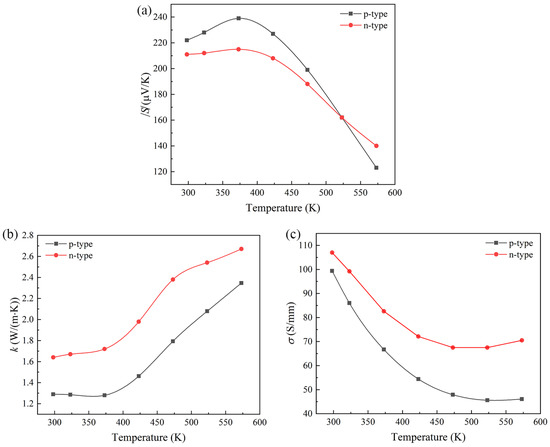 The materials that make up the FFTEM module include a substrate composed of ceramic plates, electrodes composed of copper metal, and n-type and p-type thermoelectric materials that enable the conversion of thermal and electrical energy. The n-type thermoelectric material is copper-doped Bi2Te2.7Se0.3. In addition, the p-type thermoelectric material is the Cu-modified Bi0.5Sb1.5Te3. The powders were sintered by spark plasma sintering under a pressure of 50 MPa at 670 K for 10 min. The main Seebeck coefficients (S), conductivity (), and thermal conductivity (k) of the materials as a function of temperature are shown in Figure 1. The absolute value of Seebeck coefficients of n-type and p-type thermoelectric materials were tested from room temperature to 573 K, with a tendency to decrease with increasing temperature. The electrical and thermal conductivities of the materials showed a non-linear change with increasing temperature. The FFTEM module designed for this work is mainly referenced in environments with low temperature differences, so that the effect of temperature variation on material parameters can be neglected.