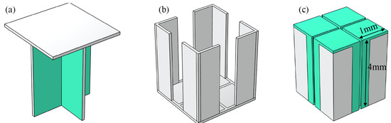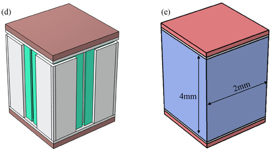 Figure 2 is a schematic diagram of a panel of p-type thermoelectric legs of a thermoelectric device with a forked-finger electrode structure. Figure 2a–c are central electrode, peripheral electrode, and p-type thermoelectric material, respectively. Figure 2d is the p-type component of the FFTEM module, and Figure 2e is the p-type component of the TEM module at the same volume of thermoelectric material. The p-type group contains two alumina ceramic plates, and two electrodes and four p-type thermoelectric materials of the same material and size are used to form the thermoelectric leg group. The electrodes are semi-enclosed to the thermoelectric leg, with the positive electrode at the top and centre of the leg and the negative electrode at the bottom and outside of the leg. The central electrode is crossed, and four thermoelectric legs are distributed around the central electrode. Peripheral electrodes wrap the bottom surface and a portion of the outer sidewall of the thermoelectric leg. Two ceramic plates sandwich the thermoelectric legs and electrodes, forming a complete p-type group. The monolithic FFTEM module contains geometrically symmetric n-type and p-type components. In a FFTEM module, the group of n-type and p-type thermoelectric is implemented in series. Meanwhile, an n-type or p-type group contains four thermoelectric legs that are electrically paralleled. The cross-sectional dimensions of each of these thermoelectric legs are 1 × 1 mm.