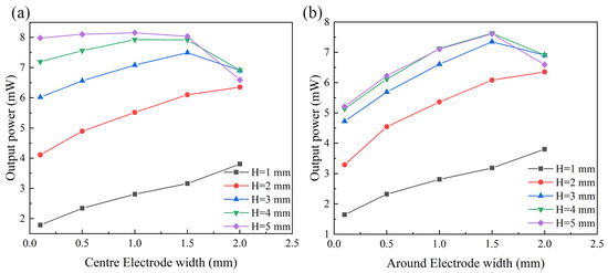 Relationship between (a) the central electrode’s width, (b) the surrounding electrode’s width, and the output power.