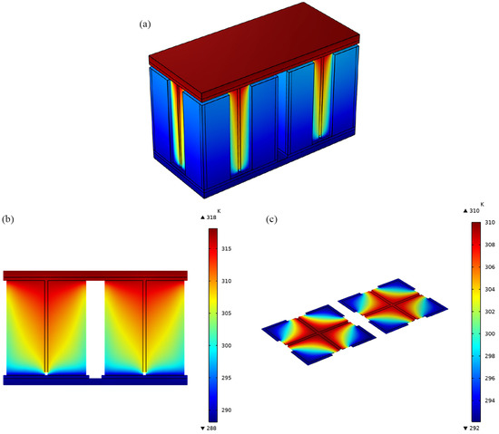 Figure 4a shows the temperature distribution of the forked-finger electrode thermoelectric module under open-circuit conditions at a temperature difference of 30 °C, where the temperature at the cold end is 15 °C and the temperature at the hot end is 45 °C. The temperature of the top ceramic substrate in the FFTEM module is higher than the temperature of the bottom ceramic substrate, and the temperature of the central electrode is higher than the temperature of the surrounding electrodes. The temperature of the top ceramic substrate in the FFTEM module is higher than the temperature of the bottom ceramic substrate, and the temperature of the central electrode is higher than the surrounding electrodes. Figure 4b shows the temperature distribution in the vertical profile of the heart of the FFTEM. In this plane, the temperature is distributed longitudinally, and the heat flow is transmitted from top to bottom. The horizontal profile in the FFTEM module is taken at half the height of the thermoelectric leg, and its temperature distribution is plotted as in Figure 4c; in the same horizontal plane, the thermal temperature distribution of the electrical module spreads from the centre outwards. This is because of the thermal conductivity of the copper; the thermal conductivity of the electrode is higher than that of the thermoelectric material, so the temperature of the central electrode is higher than that of the surrounding thermoelectric material in the same horizontal plane. When the z-axis height varies, the temperature distribution in the horizontal profile also varies. The FFTEM module uses the different thermal conductivity of the metallic copper electrodes and the thermoelectric material as a basis for the TEM module, changing the temperature distribution inside the module by regulating the electrodes. The temperature distribution within the module is changed by regulating the electrodes. This structure results in a higher output power at lower temperature differences. The temperature distribution of the TEM under open-circuit conditions with a temperature difference of 30 °C is in the Supplementary Materials Figure S1.