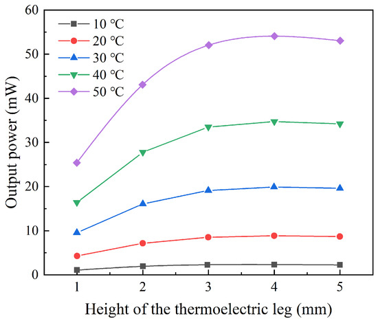 Figure 5 depicts the relationship between the height of the thermoelectric leg and the output power of the FFTEM module. The temperature difference has different characteristics depending on the thermoelectric leg height and output power. When the temperature difference is 10 and 20 °C, the output power of the FFTEM tends to increase and then stabilise as the height of the thermoelectric leg increases. For temperature differences of 30, 40, and 50 °C, the output power of the FFTEM increases and then decreases. The minimum accuracy of the temperature difference calculation in this paper is 0.1 °C. The FFTEM module changes the distribution of the heat flow; instead of flowing in a single direction, the heat spreads in several directions at the same time. Therefore, the height of the thermoelectric leg should not be greater than 4 mm when the cross-sectional area of the FFTEM module is constant. The relationship between the height of the thermoelectric leg and the output power of the TEM module for the same volume of thermoelectric material is shown in Figure S2 of the Supplementary Materials.