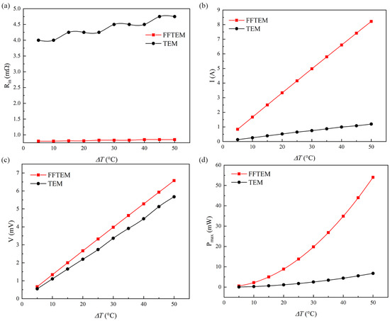 (a) The inner resistance, (b) output voltage, (c) working current, and (d) maximum output power for the FFTEM and TEM models as a function of ΔT at a matched load condition.