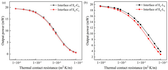 Relationship between interface thermal resistance of (a) the central electrode, (b) the surrounding electrode, and output power.