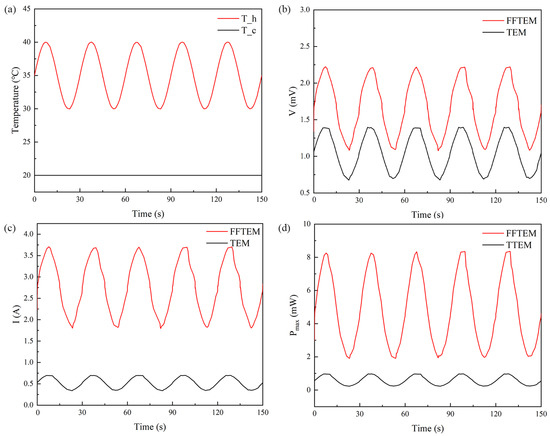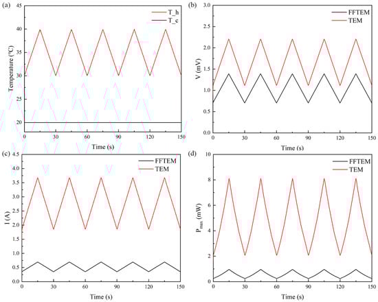 To investigate the transient output characteristics of the FFTEM, the temperature conditions are shown in Figure 9a. The temperature at the cold end () was 20 °C for both the FFTEM and TEM, and the temperature at the high end () showed fluctuations with time. Figure 9b–d depict the output voltage, operating current, operating temperature, and the output power characteristics of the FFTEM and TEM, respectively, in the load-matching condition. When the temperature difference fluctuates sinusoidally between 10 and 20 °C with a period of 30 s, the maximum output power of the FFTEM is between 1.90 and 8.77 mW. The TEM output power ranged from 0.22 to 0.97 mW. The output power was collected over five cycles and analysed to obtain the output power of the FFTEM’s sparring, which was nine times higher than that of the TEM. The power calculations for the FFTEM and TEM modules do not include the effects of Joule diffusion. In order to increase the accuracy of the calculation, the maximum temperature difference of the FFTEM module does not exceed 20 °C under periodic temperature boundary conditions. This shows that the FFTEM has a higher output power than the TEM under fluctuating temperature conditions.