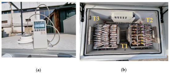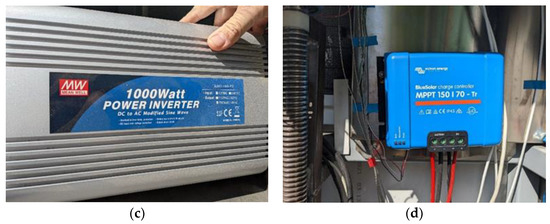 In accordance with the above results, the following equipment was selected for the electrical power supply system: 3 Polycrystalline PV panels produced by Victron energy, model BlueSolar SP042702000 [31] () with a nominal power of (Figure 4a); and a battery system comprised of four sealed gel batteries with a rated power capacity of produced by Victron energy, model BAT412121104 [32] (Figure 4b). In order to convert the DC current produced by the PV array, the system was connected to an inverter with a rated power of produced by Mean Well, model A301-1K0-F3 [33] (Figure 4c) with an efficiency of 82%. The output of the PV array as well as the charging of the batteries was controlled via a Maximum Power Point Tracking (MPPT) solar charger produced by Victron energy, model BlueSolar MPPT 150|70–Tr [34] (Figure 4d) with 98% energy conversion efficiency.