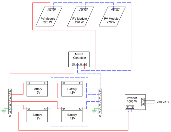 For controlling the flow of current from the PV array to the batteries and the inverter, a MPPT charge controller was selected [34]. MPPT controllers are known for their efficiency in converting the input voltage from PV arrays into a lower voltage appropriate for charging batteries, all while providing close to maximum power [35]. The efficiency in such systems is well documented [36,37,38]. The BlueSolar MPPT solar charge controller has a rated DC/DC conversion efficiency of 98% [34]. The technical documentation of this MPPT solar charger [34,35] does not go into detail regarding the algorithm it uses for tracking the maximum power point due to the algorithm’s proprietary nature.