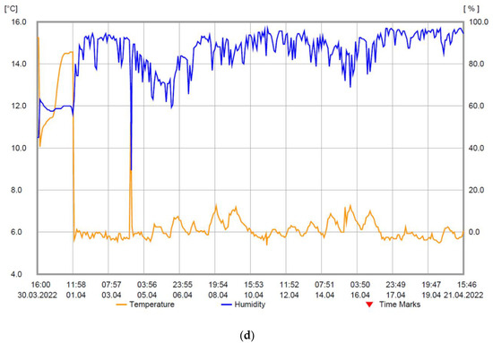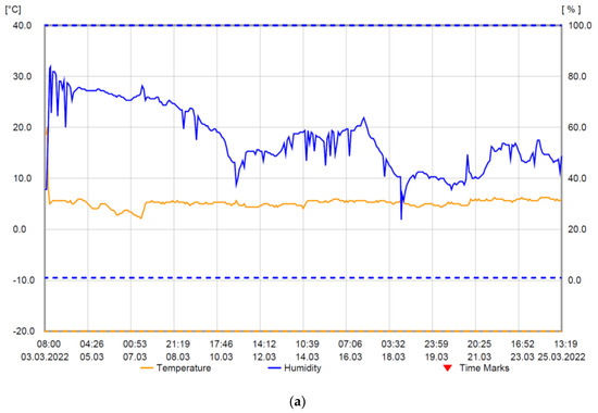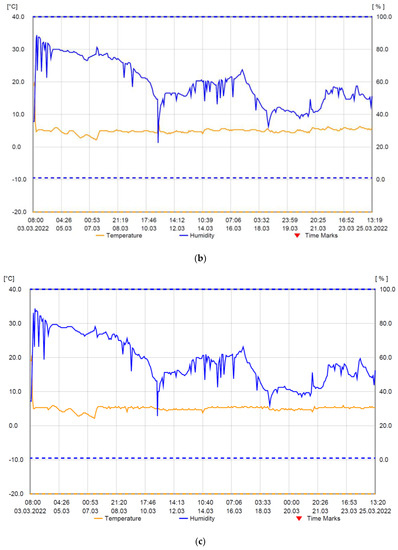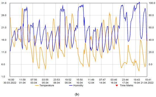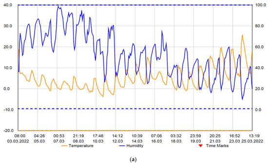 The outdoor temperature in the two monitored time intervals varied in the range −4– 28 °C and the relative humidity in the range 22–100%, according to Figure 7a,b, with an average of around 50%.