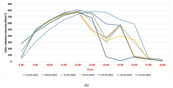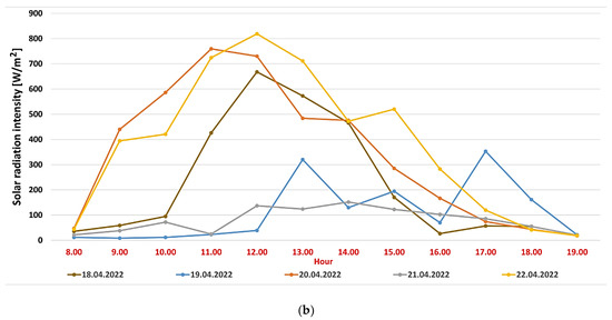 According to Figure 10a,b, the intensity of the solar radiation reaches maximum values between 11–15 h, with values between 290–810 W/m2 when the sky is clear and, in comparison, in the most unfavorable conditions, when the sky was covered by clouds the entire day (21 April 2022), an average value of 100 W/m2 was recorded during the same hourly interval.