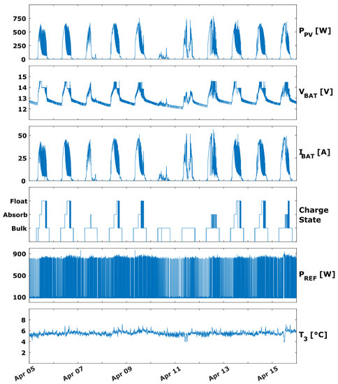 Of great interest in our study is the behavior of the MPPT solar charge controller and of the battery array, notably its performance in different environmental conditions (days with high/low solar radiation). To this end, Figure 14 highlights the behavior of the MPPT solar charge controller in two such cases. Figure 14a shows the MPPT controller functioning under normal, favorable conditions (on the 6 April 2022) and the battery array can be seen going through all of its charging stages. Figure 14b, on the other hand, highlights the system’s behavior under unfavorable conditions (on the 11 April 2022). In this latter case, the battery does not pass through all of its charging stages.