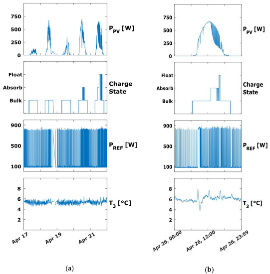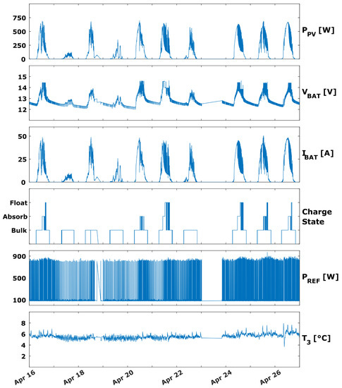 When conditions are unfavorable, as highlighted in Figure 14b. the MPPT controller enters the bulk stage in the early morning as usual, but never manages to exit this stage, since, as can be seen in Figure 14b, the battery array voltage , never reaches the upper value of . Consequently, the absorption and float stages are never triggered by the MPPT controller. This behavior becomes even clearer when looking at Figure 15a, where, over the course of three days with low solar radiation, the battery array is never seen to enter the absorption or the float stages. During this time, the quasi-constant temperature indicated by thermocouple T3 signifies that the electrical load was covered by the battery array. On 20 April, when the solar radiation rises, the battery array is seen entering the absorption stage but not quite managing to reach the float stage, as evidenced by the frequency with which it re-enters the bulk stage. Finally, on 21 April, the battery array resumes it normal three-stage charging cycle. These results indicate that even after 3 days of unfavorable conditions, the battery array managed to reach full capacity within 2 days of normal operation.