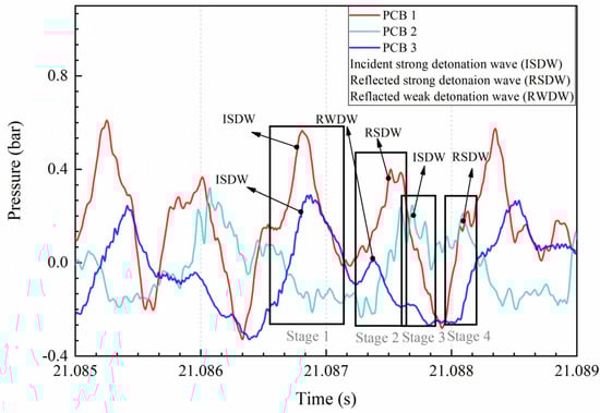 Figure 6 demonstrates the typical pressure signal of the detonation-wave propagating cycle in small-scale RDE. The two pressure transducers (PCB 1 and PCB 3) could trace the arrival of two incident strong detonation waves almost simultaneously, as well as the departure of two strong reflected waves, which means that the collision point is in the middle position between these two PCBs. The third pressure transducer (PCB 2) then detects another collision event. Figure 7e–h describes the whole process of the two strong detonation waves colliding in one cycle in detail (corresponding to stages 1–4 in Figure 6).