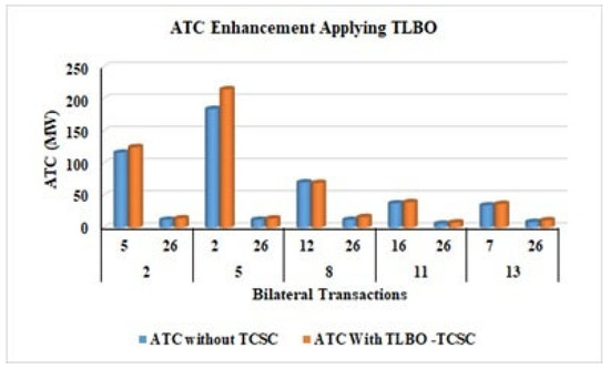 Figure 9 elaborates the enhanced ATC values when TCSC is optimized with the TLBO technique. From the results, it is observed that the ATC value for different bilateral transactions is enhanced. For transaction between 2–5, the ATC value is increased from the base case value of 116.5 MW to 125.13 MW and for the transaction 2–26, the ATC value is increased from 12.18 MW in base case to 14.53 MW with TLBO optimized TCSC. Similarly, significant ATC enhancement is achieved for both nearby bus and far away bus for each bilateral transaction. The ATC value for distant situated lines is increased significantly and can be concluded from Table 1. The proposed algorithm not only has increased the ATC value for nearby situated lines, but also for distant situated lines and hence enhance the overall ATC of the test system. With the enhancement of ATC, the active power losses also increase due to increased power flow through the lines during bilateral transactions.
