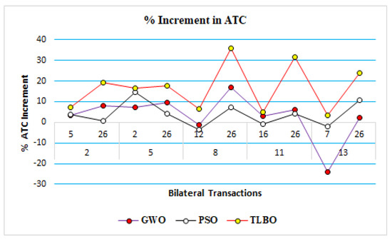 Comparative percentage increment in ATC by GWO, PSO and TLBO.