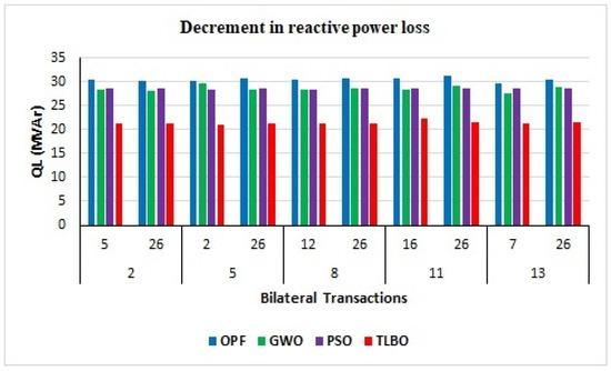 The reactive power losses are also calculated here and given in Figure 11. The results show that with the enhancement of ATC, the active power losses are increased, but the reactive power losses are decreased. Figure 11 presents the comparative analysis of reactive power losses reduction by the proposed TLBO, GWO and PSO algorithms. It is observed that maximum reduction in reactive power loss is obtained with the application of TLBO optimized TCSC. The average power loss in base case for all the transactions considered is 30.481 MVAr. With the application of TLBO, GWO, and PSO, the average reactive power loss is reduced to 21.44 MVAr, 28.556 MVAr, and 28.593 MVAr, respectively. This means that the reactive power losses are reduced by 29.65%, 6.28%, and 6.19% by the application of TCSC optimized by TLBO, GWO, and PSO, respectively, and hence the results of TLBO are better than GWO and PSO.