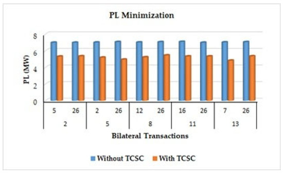 Figure 13 indicates the percentage reduction in active power loss achieve with the implementation of TCSC optimized by GWO, PSO and TLBO for all the bilateral transactions considered. It can be depicted from Figure 13, that overall active power reduction for the bilateral transactions under consideration is 3.15% in case of GWO, 3.822% in case of PSO, and it is 16.76% when TLBO is applied to locate and optimize the size of TCSC.