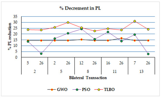 Comparative percentage decrement in PL by GWO, PSO and TLBO.