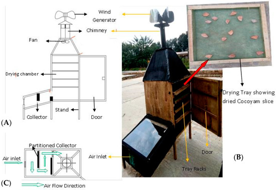 (A) Schematics of the partitioned single passage solar dryer indicating the wind generator (B) The picture of the solar dryer (C) Air flow direction.